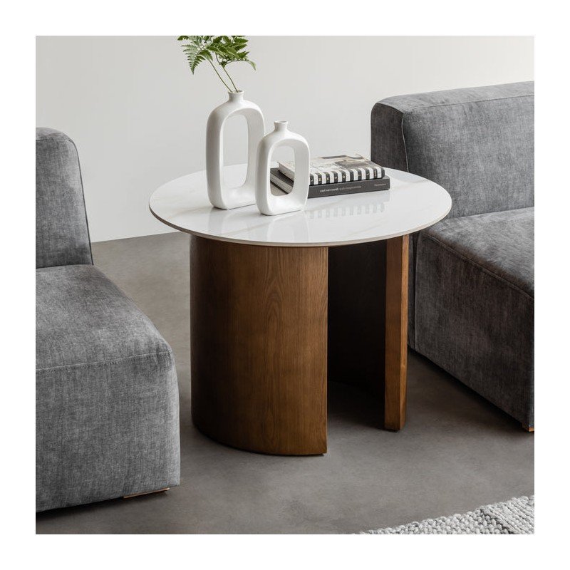 SOREN שולחן סלון עגול בשילוב עץ אלון מלא ופלטת קרמיקה בגימור שיש